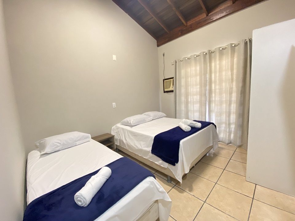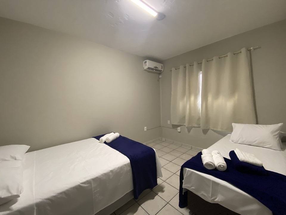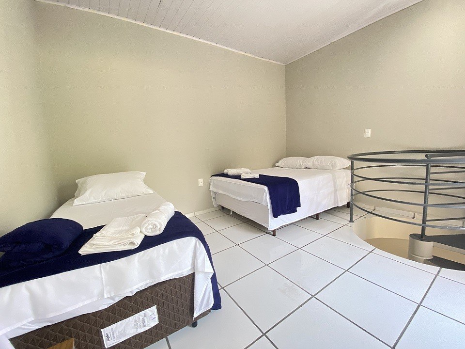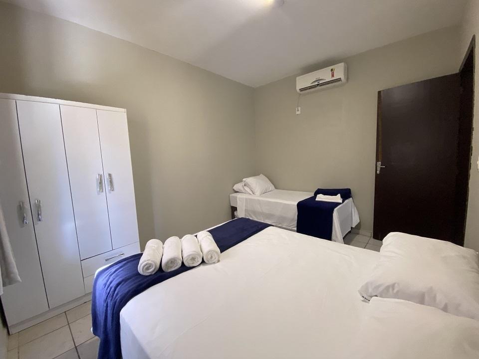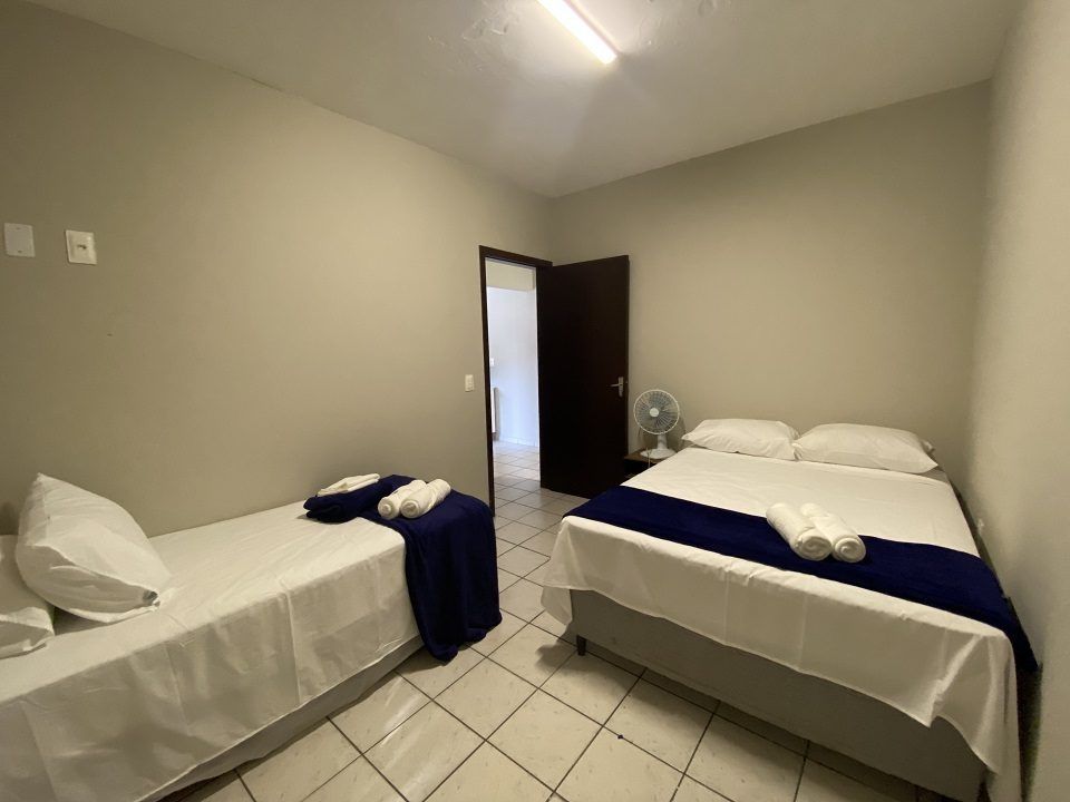 Essa acomodação comporta de 06 a 08 pessoas , possui dois quartos separados sendo um quarto para casal e o outro quarto uma cama de casal box com duas camas de solteiro mais auxiliares também cada quarto com um roupeiro separado. Cozinha completa e acessórios para churrasco. Com ampla sacada de frente para a avenida.