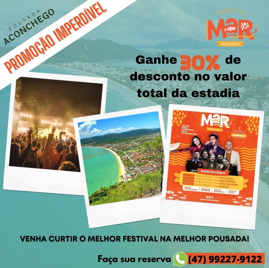 Aproveite o Festival do Mar em Bombinhas e venha se hospedar conosco com 30% de desconto sobre a estadia. Serão shows nacionais imperdíveis e uma programação intensa em esportes e gastronomia.